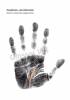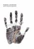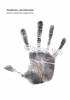 Auf den Handabdrücken auf Papier zeichnet sich die ausgewaschene Lebenslinie als breite weisse Linie ab.